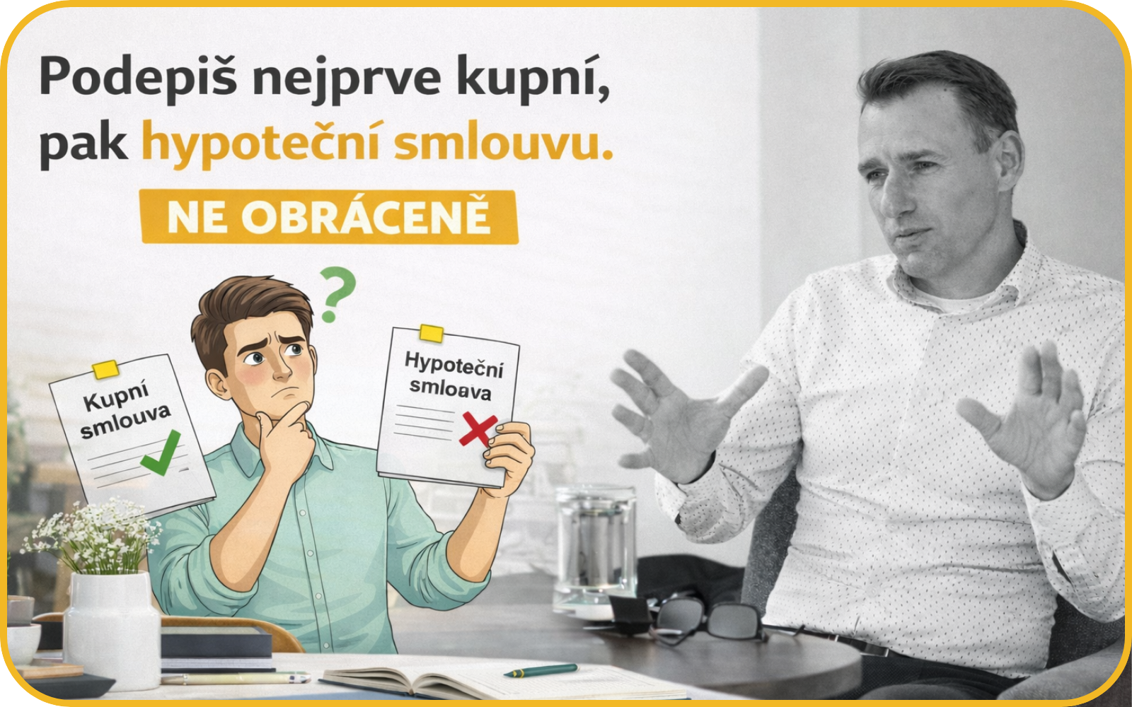 Potřebné podklady a jejich předání bance spolu budeme komunikovat až do schválení hypotéky. - Vy podepíšete, já vyřídím katastr